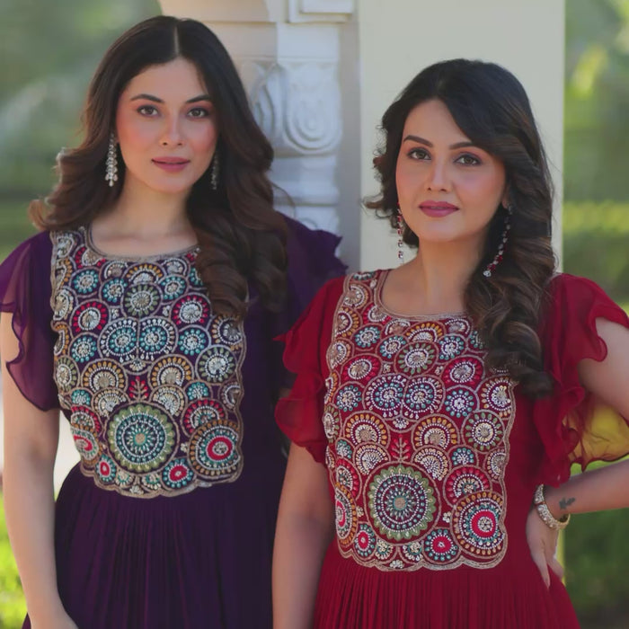 Maroon Faux Blooming Embroidered Navratri Gown with Bell Sleeves – Mayara Women Clothing