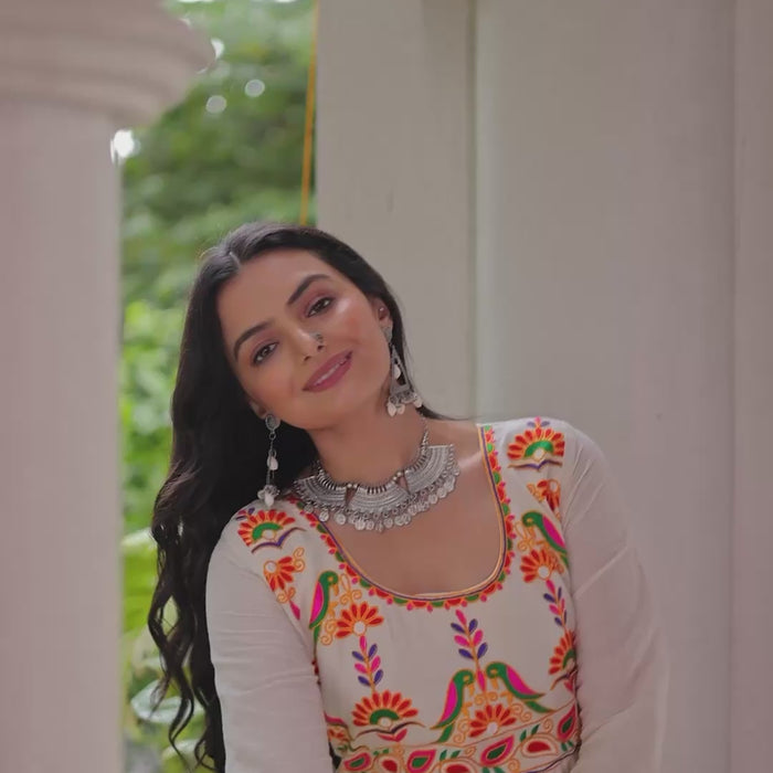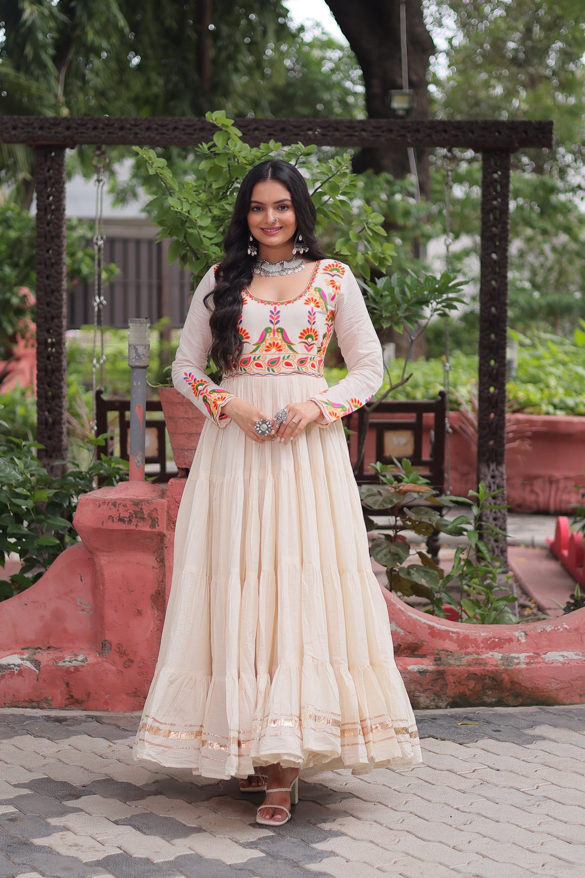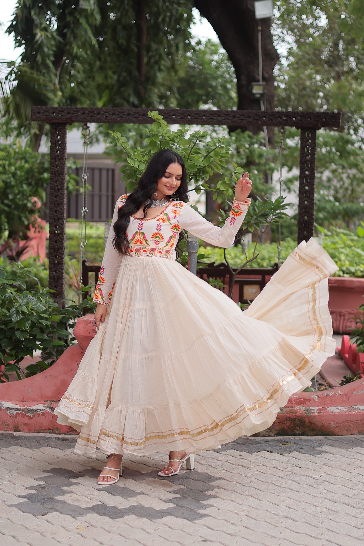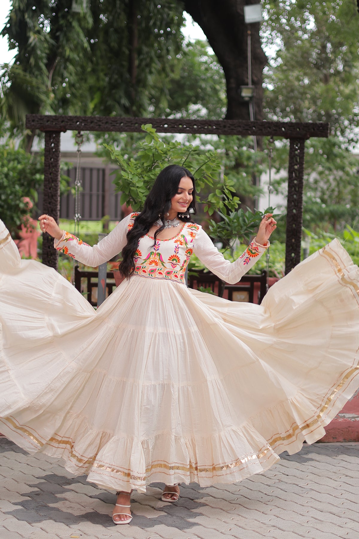 Off-White Kora Cotton Embroidered Gown for Navratri – Heavy Flair Anarkali Style with Gota Patti Work, Mayara Women Clothing